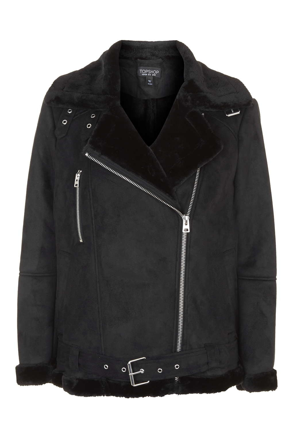 An aviator style faux leather jacket with mock faux collar and lining. Black faux leather biker jacket blue fur collar fleece lined goth gothic sz 10. The combination of leather and pure shearling makes this jacket warm.