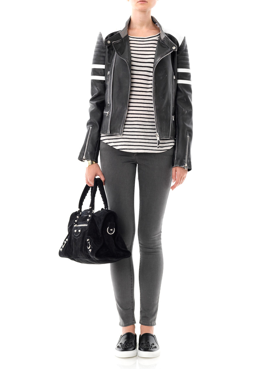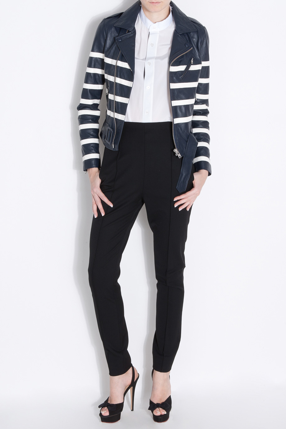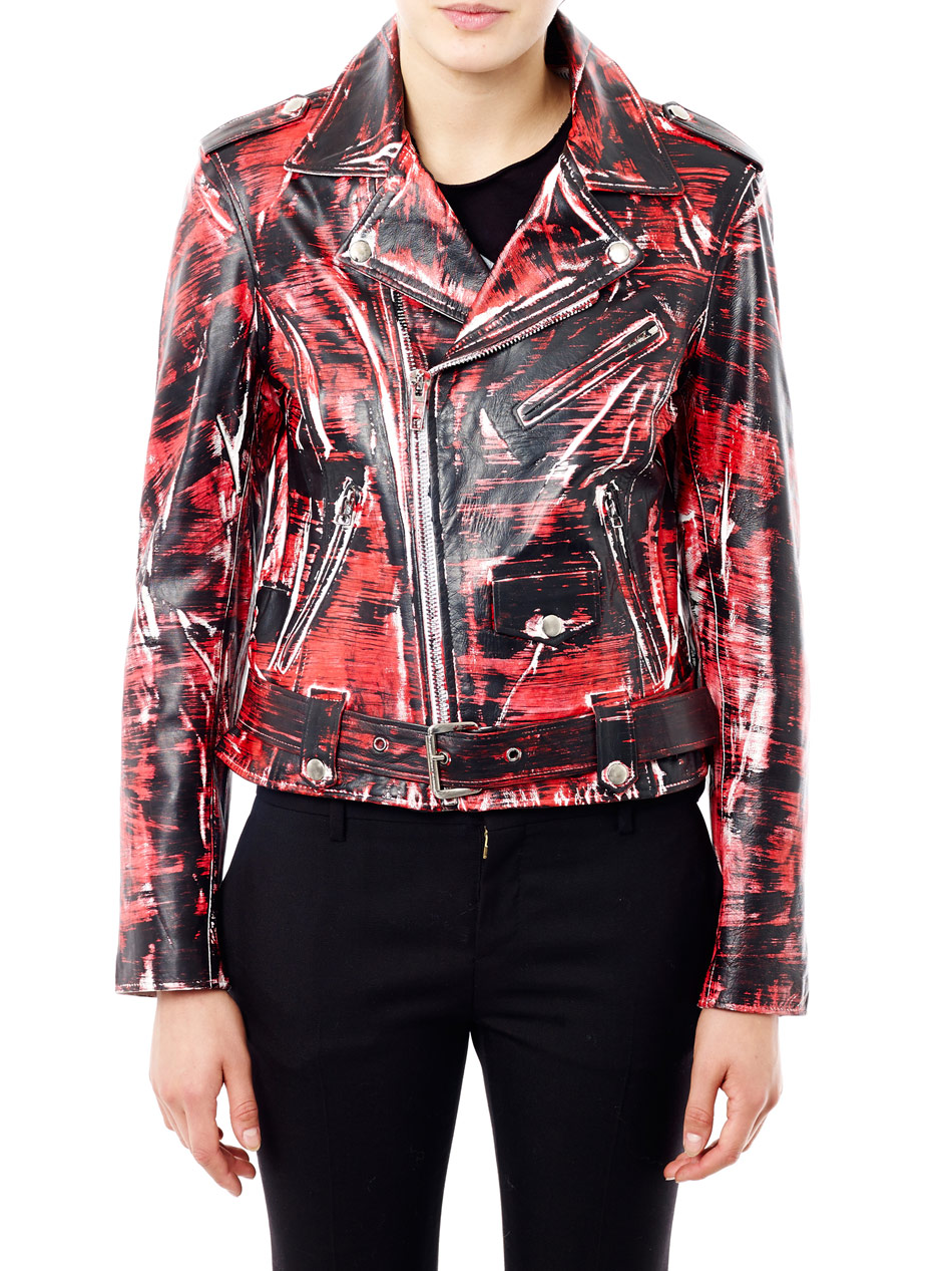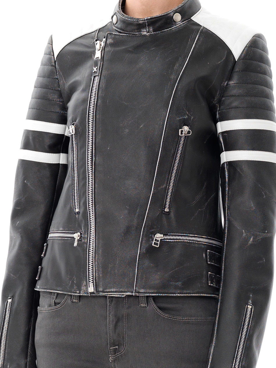 From the contrasting black stripes to the exposed zips, this biker style exudes edgy appeal. From the contrasting black stripes to the exposed zips, this biker style exudes edgy appeal. Complete with silver tone hardware and zip cuffs. Women's black leather biker jacket from parisian brand each x other with contrast red leather stripe detail and a slim, cropped fit.
