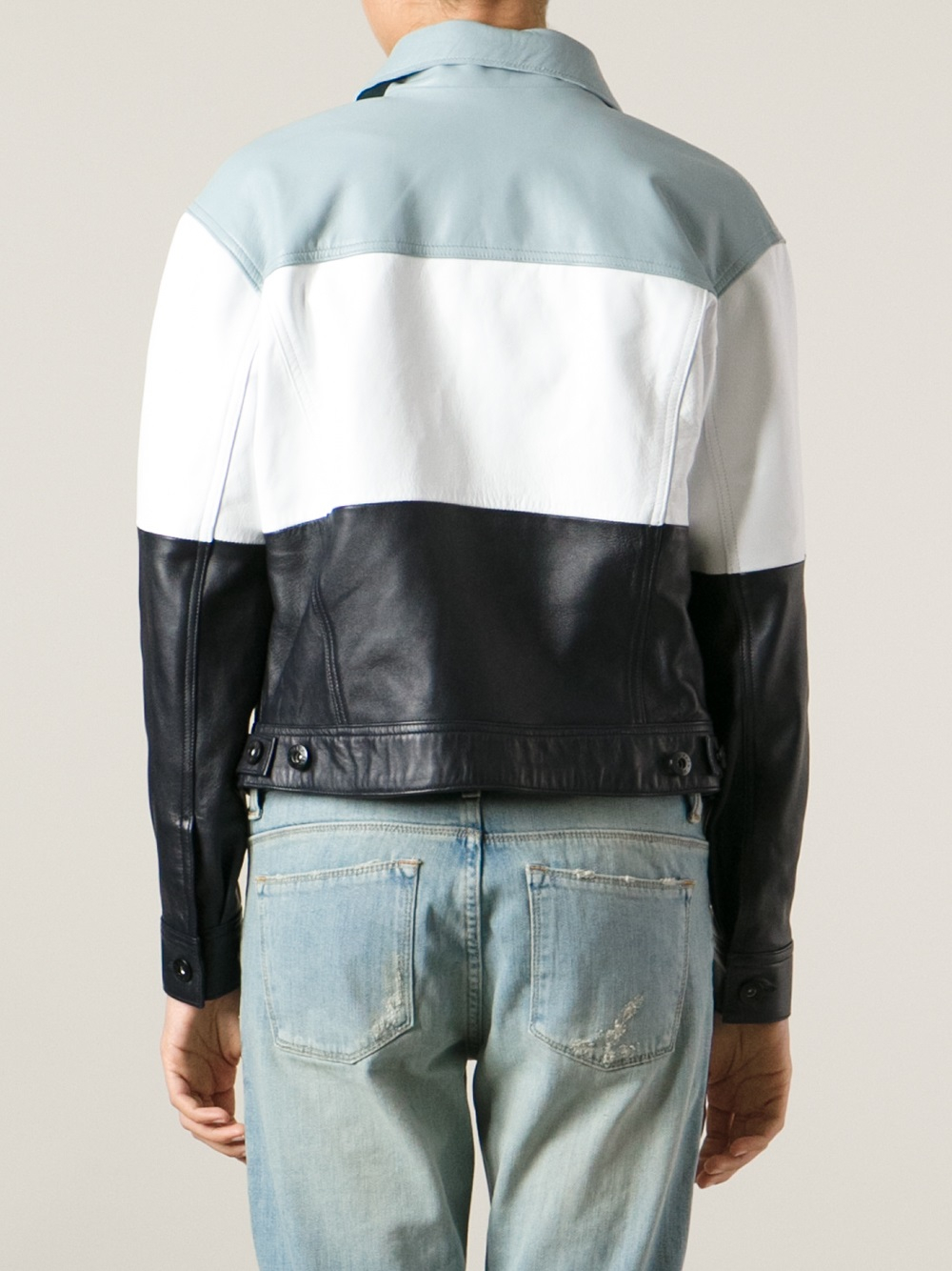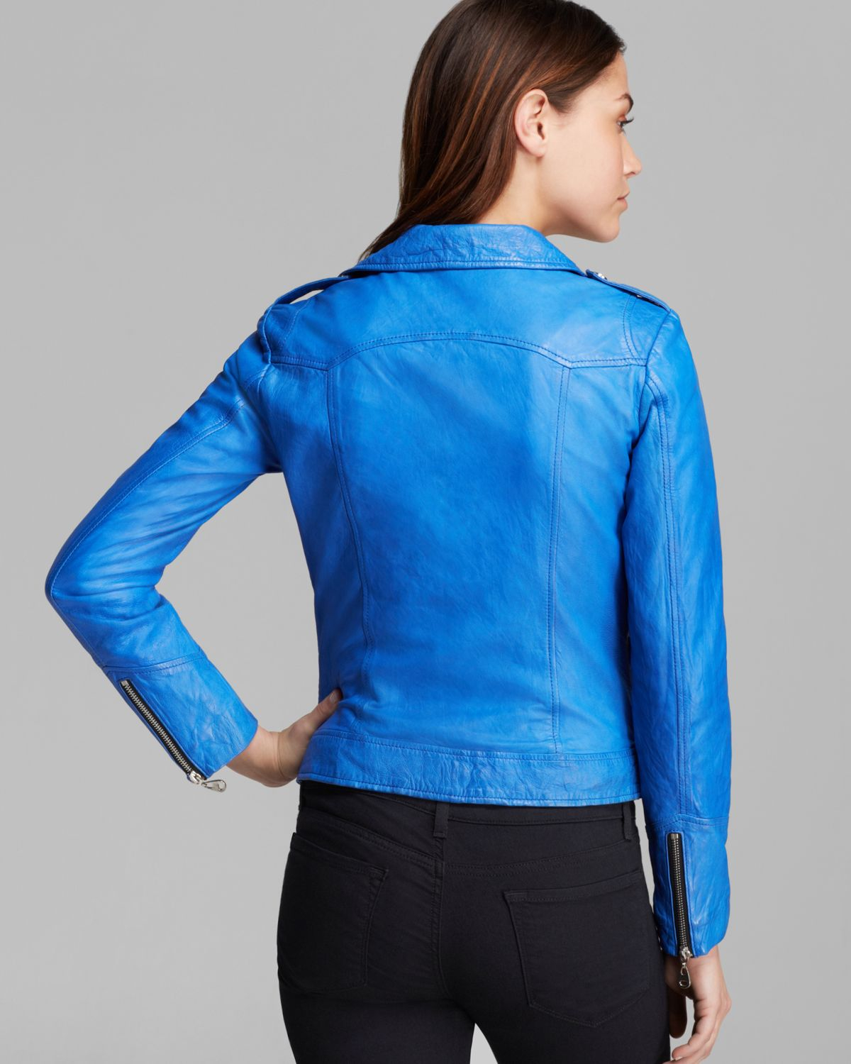 Iro ashville blue leather biker jacket fr34 uk6 us2 new auth. The jacket maker's assortment of blue leather jackets is as creatively diverse as it is unique and original. A wide range of colors do define the style you wish to carry, for a rugged look trying the classic tan brown is the best option. If you don't want to buy a pure black leather jacket, this is the best choice for you.