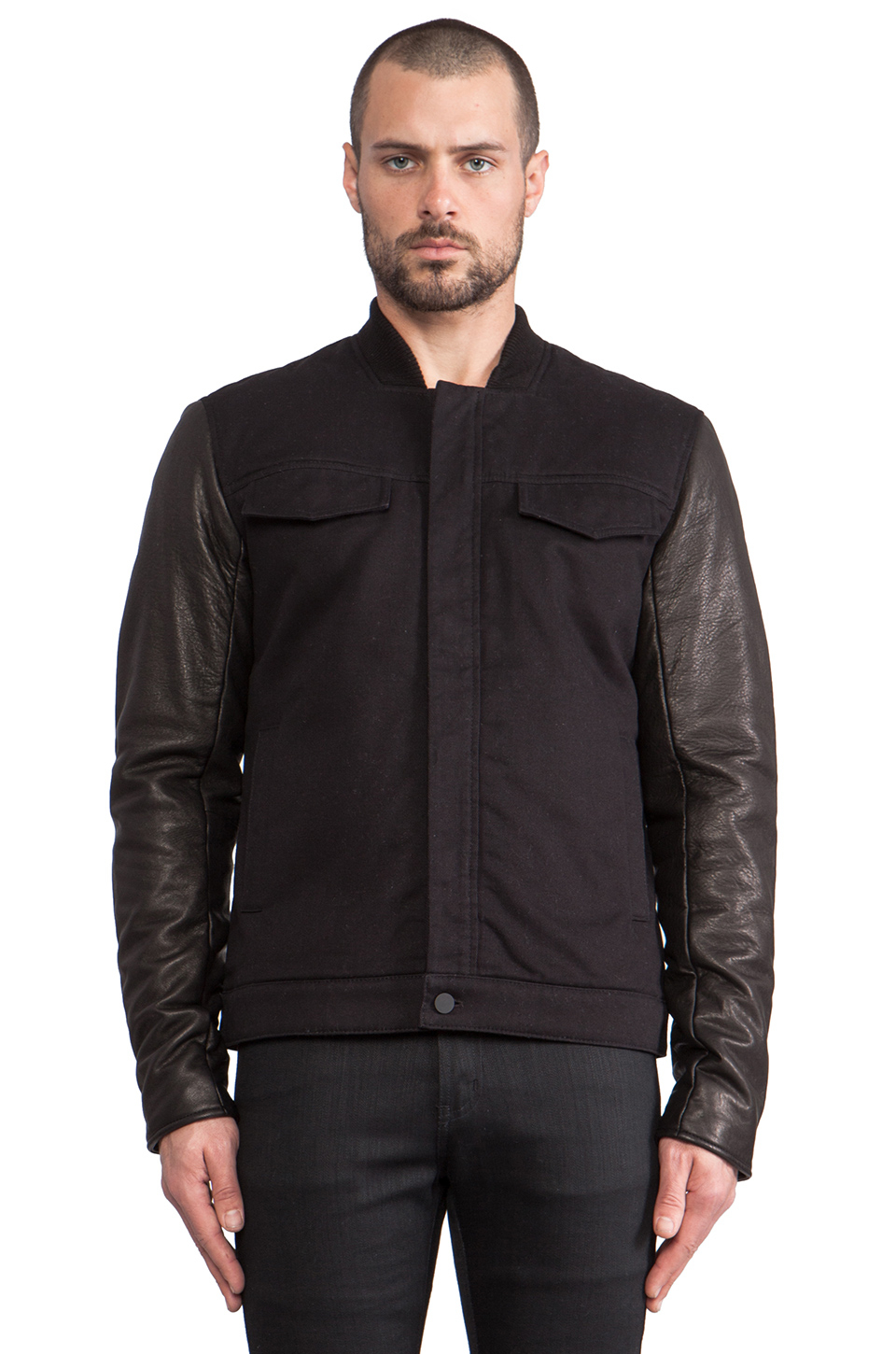 4.8 out of 5 stars with 11 ratings. Dsquared2 denim bomber jacket w/ leather sleeves $1,382 $1,975. Rag bone denim jean jacket black lamb leather sleeves bleach out size m.