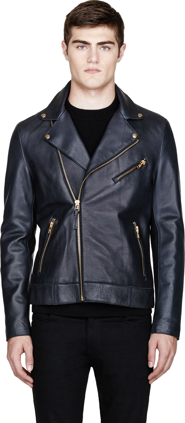 Mens Navy Leather Biker Jacket. Featuring traditional detailing including an asymmetric zip fastening, zipped cuffs and quilted shoulder panels. This biker jacket is made of leather and is designed for men. Motorcycle jackets come in all shapes and sizes.