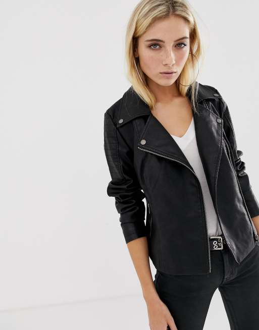 Short Black Leather Look Jacket. Sebby collection women's plus faux leather racing jacket with detachable cable knit hood. Black leather jacket over a graphic tee. Finally, wear some jewelry to add a finishing touch.